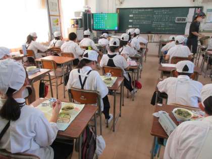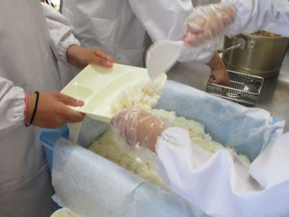 手指消毒、マスクはもちろんのこと、配食の当番は手に手袋をつけて配食し、感染症に十分気をつけて行いました。食べる際もこれまで同様、全員前向きで間隔をあけて黙って食べていました。
