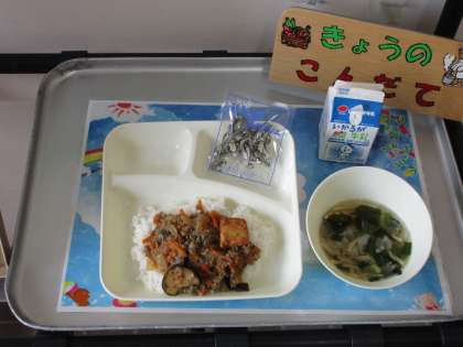 今日から給食が始まりました。2学期最初の献立はマーボーあつあげ丼、中華スープ、ミニフィッシュ、牛乳でした。