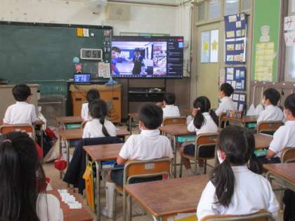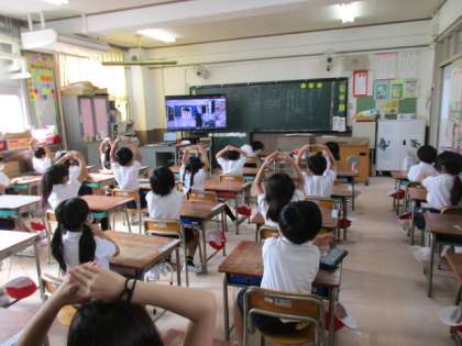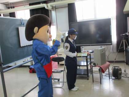 今回は感染リスクを避けるため、多目的室から1年各教室へリモートで指導をしていただきました。誘拐犯の手口や狙われやすい子はどんな子かなど教えていただきました。着ぐるみの犯人役がとても上手で子どもたちは楽しみながら学習し、とてもわかりやすかったようです。