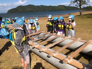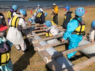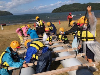フロートの上に木枠を載せて紐で結びつけていきました。