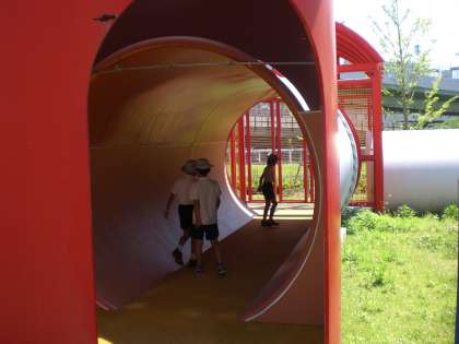 そのあと、「水」をテーマにした広場で遊びました。実際に使っている「水道管」を利用した遊具や、水の圧力を利用した道具等がありました。ここでは、大きさや手応えを体感することができました。