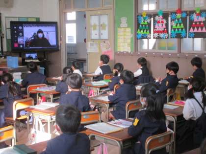 校長先生からは2学期がんばっていたことや新年を迎えるにあたってのお話がありました。生活指導の担当からはお年玉の使い方や安全・防犯など冬休みの過ごし方についてお話がありました。各教室では大型テレビを通してしっかり話を聞いていました。