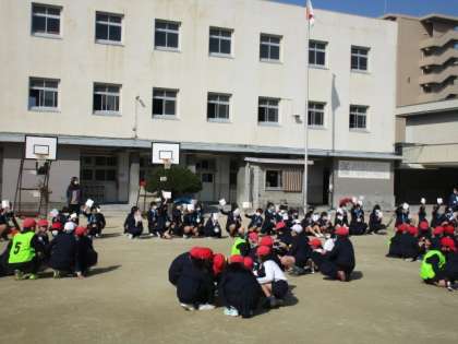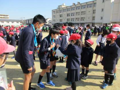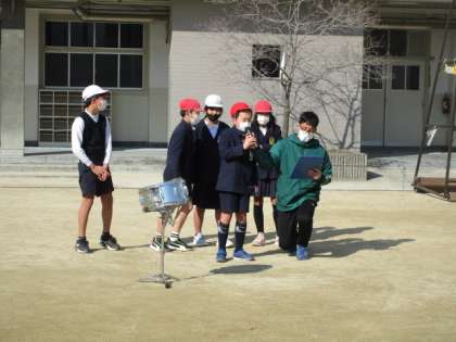 6年生ありがとう会を行いました。児童会の5・4年生が中心になって企画しました。感染対策のため運動場で実施しました。6年生へのプレゼントは1年生からはメダルが、2〜5年生からは手作りの胸花が贈られました。ゲームでは6年生にまつわる〇×クイズを楽しみました。わくわく班で話し合って答えを決め、6年生が赤白の札で正解を表していました。