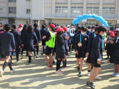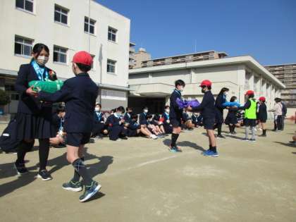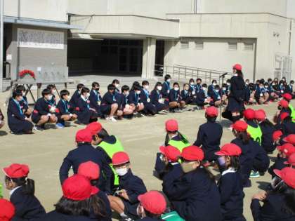 会の終わりに6年生が縫った雑巾を1〜5年生と保健室、職員室にプレゼントされました。最後に在校生代表が6年生に感謝の言葉があり、そのあと在校生で花道を作り、6年生を花のアーチと拍手で送りました。