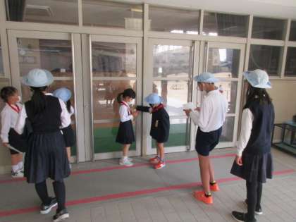 対面式の後、1年生は学校めぐりをしました。6年生のお兄さん、お姉さんに手をつないでもらい、職員室や保健室、ひまわり教室など学校にある色々な部屋を回っていきます。6年生がそれぞれの部屋がどんな部屋なのか優しく説明していました。1年生はカードにシールを貼ってもらい嬉しそうでした。