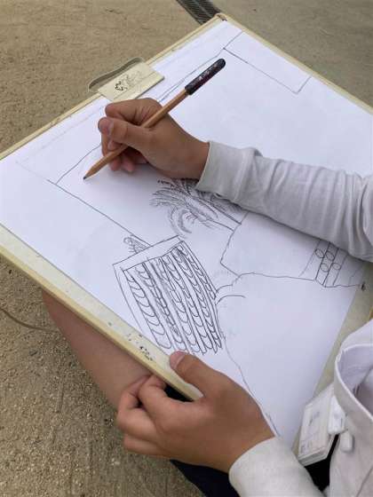 6年間通った校舎を絵に描いています。実際に見ながら描くのはとても難しいようで苦戦している児童もいましたが、みんな意欲的に取り組んでいました。絵の具で濃淡を付け、影を表現したり、壁のタイルの色を一つ一つ工夫したり、頑張っていました。1か月近くかかり作り上げた大作です!!!!