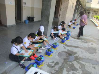 1年生が生活科で植えた朝顔の種から芽が出て双葉が開いています。その様子を観察してカードに記入しました。「葉がツルツルしている」「ちょうちょみたいな形」「双葉の間からもうひとつ出てきている」などいろいろと見つけて絵に表していました。水やりも一生懸命にしています。暑くなってきているので、これからどんどん成長していくことでしょう。