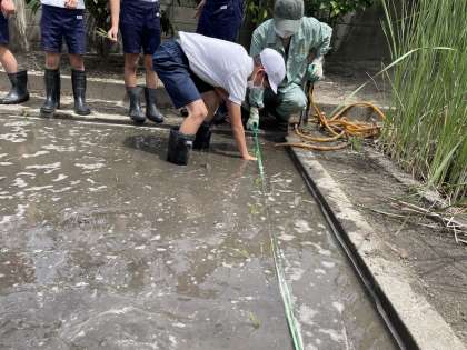 今日5年生は、学習園にある田んぼで田植えをしました。初めて田んぼに入った子どもたちは、泥の感触に「きもちいい!」「埋もれてしまう!」と楽しそうに声を上げていました。
