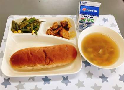 今日の給食は、「黒糖パン・鶏肉のカレーマヨネーズ焼き・てぼ豆のスープ・さんどまめとコーンのサラダ・牛乳」でした。
