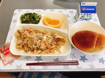 今日の給食は「黒糖パン・和風やきそば・オクラの甘酢あえ・オレンジ・牛乳」でした。