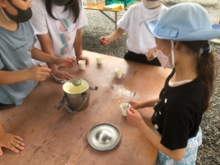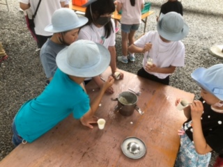 20分転がし終わりアイスクリームが完成しました。みんなで取り分け試食タイム。おいしーい!どの班も大満足でした。