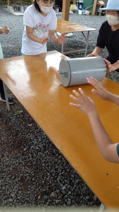 ごほうびのアイスづくりです。おいしく作るコツは協力して20分間転がし続けることです。