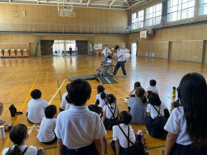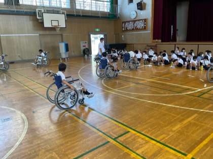 7月1日(金)4年生は、車椅子体験学習を行いました。車椅子の操作方法や介助するときの注意などを話を聞いたり、実際に乗ってみたりして学びました。子どもたちからは、「段差がこわかった。」「坂を押すのが大変だった。」「難しかったけど、楽しかった。」などの感想が聞こえてきました。
