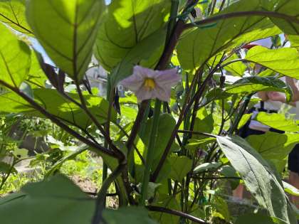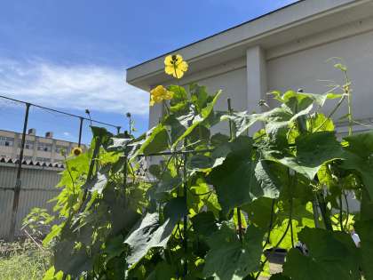 暑さに負けず、ナスときゅうりがきれいな花を咲かせています。