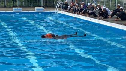 実際に服を着て、泳いだり浮いたりする練習をしました。