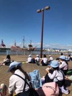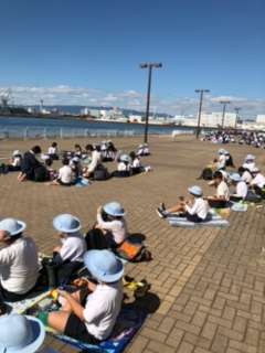 大阪港を眺めながらお弁当を食べています。時々船が行き来しているのが見えます。仲良しの友だちと楽しく美味しそうに食べています。