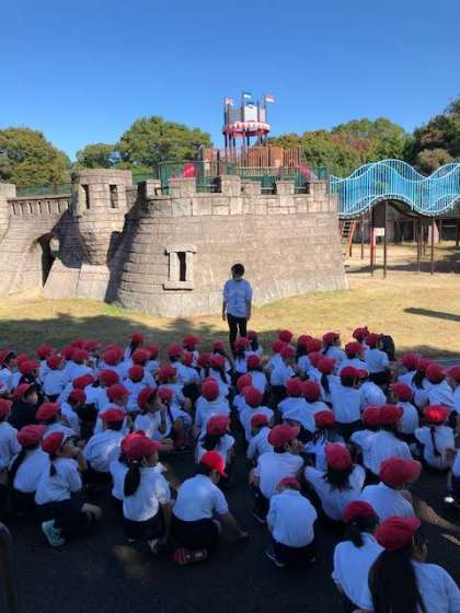 今日は1年生が校外活動に出かけています。深北緑地に到着し『とりでの広場』で遊んでいます。昨日の雨で少し濡れていますが、元気に遊んでいます!