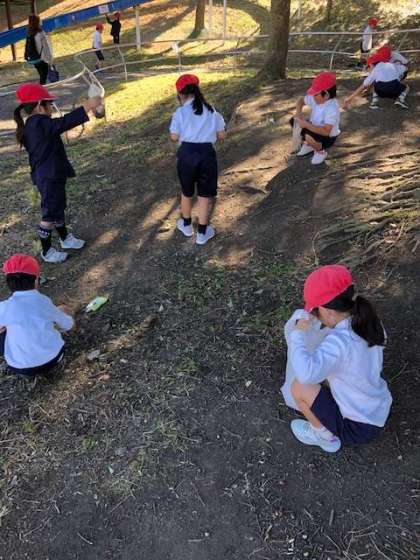 ドングリの木の下にたくさんドングリが落ちていました。帽子付きのドングリを見つけ見せに来てくれます。持って来た袋に入れて今日のお土産です。