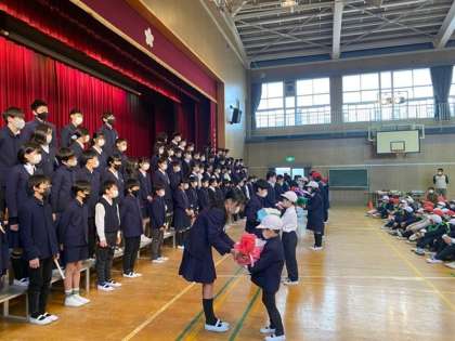 メッセージカードとありがとう会を開催していただいたお礼に、6年生からはこれからも学校をきれいにしてほしいという気持ちをこめて、家庭科の学習で作った「ぞうきん」をプレゼントしました!