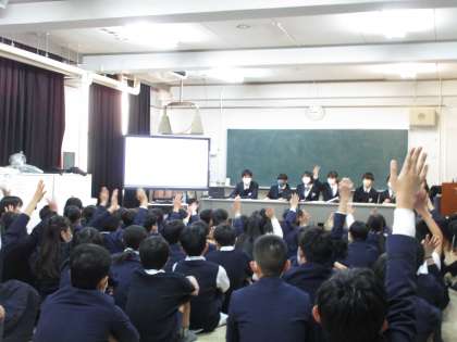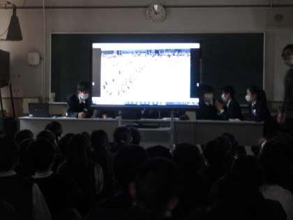 小中交流がありました。茨田中学校の生徒会が来校して6年生に中学校生活について紹介してくれました。学校行事のやテスト、小学校との違いなどについてクイズを交えながら楽しく説明してくれました。生徒会には茨田南小学校の卒業生も数名いて、とても頼もしかったです。また、部活動紹介では各クラブが作成したメッセージ動画が流されました。中学校生活について知ることができ、6年生の子たちは進学への希望が持てたのではないかと思います。茨田中学校の生徒会の皆様ありがとうございました。