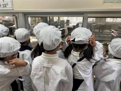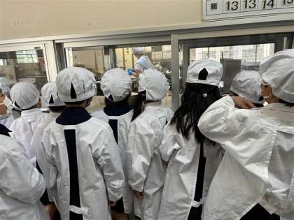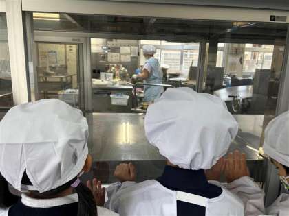 そこで、給食調理員さんにお願いをして実際に作っているところをガラス越しに見学させていただきました!!