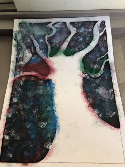 今現在は、スポンジでなじませながら色付けをしています。どんな「夢色の木」が完成するのか楽しみです!