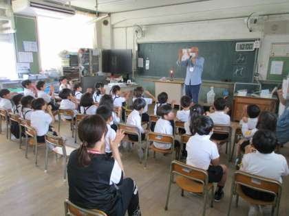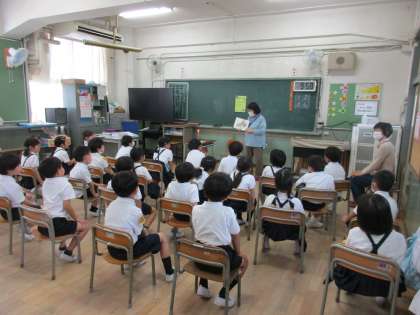 今日はお話会がありました。鶴見区のおはなしサークル「でんでんむし」の皆さんにお越しいただき、1・2・3年生の各教室で童話や昔話などをお話しいただきました。毎年恒例となっていますが、ろうそくを灯して薄明るい雰囲気の中で行ってくださいました。3つのお話をしていただきましたが、子どもたちは1つ目からすっかりお話の世界に入り込んでいました。途中で手遊びなどを入れながら45分間楽しい時間を過ごすことができました。これを機に、図書室でもいろいろな本を借りて読書を楽しんでほしいです。