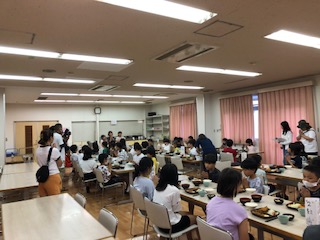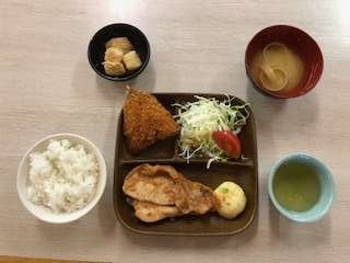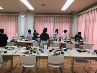 夕食の時間です。食事係が準備で活躍しています。献立は豚生姜焼きや魚フライ等です。おいしくいただきまーす!