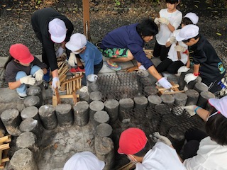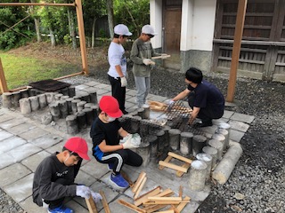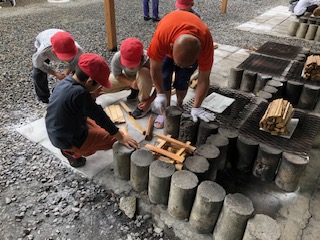 まきを組んでかまどで火の準備をしています。うまく燃えるかな?