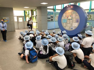 4年生が庭窪浄水場の見学に来ています。人数制限があるため、昨日と今日の2日に分けて来ています。今日は2組が見学です。先程到達して、DVDで「水のできるまで」を学習しています。