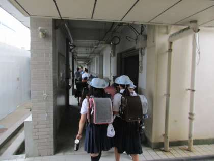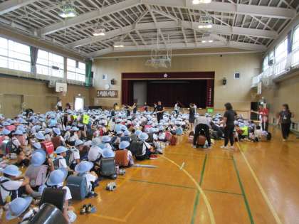 緊急時に備えての集団下校を実施しました。講堂に全学年が集合し、コースの色ごとに分かれ兄弟は横に並ぶ形を作りました。いきいき活動や学童、デイサービスに行くなどそれぞれの下校の仕方になっていますが、全て確認して下校を行いました。予定よりも時間がかかりましたが、間違いなく集団で下校できたのではないかと思います。初めての方法なので、今後改善できることは改善していきます。