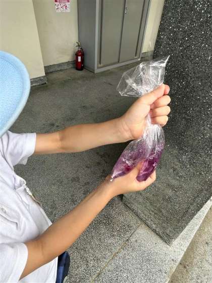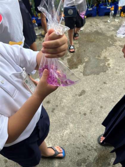 袋に水を入れて、モミモミすると・・・だんだん色がでてきました!