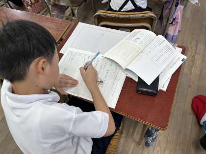 国語科で「山場のある物語を書こう」を学習中です。教科書の3つの絵の中から好きな絵を選んで物語を書いています。みんなとても集中して、頑張っていました。夏休みに読書感想文を頑張った成果が出ています。