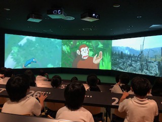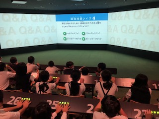 工場内のシアターでアニメを見ながら地球環境についてのクイズに答え盛り上がりました。