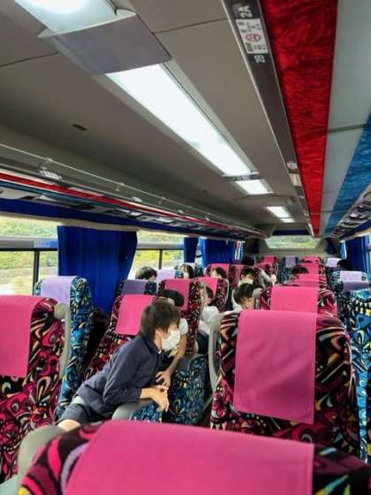 バス車内は、バスレク係による『インタビューゲーム』で盛り上がっています!