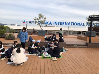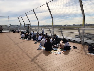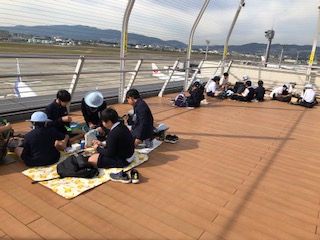 陽当たりのよい展望デッキで飛行機を眺めながらのお弁当タイムです。他の学校も来ていないので、ゆったりとしています。