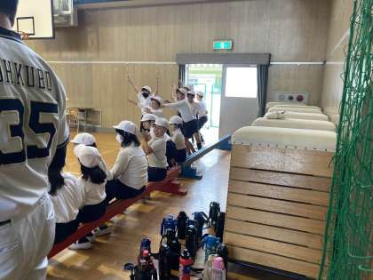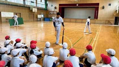 今日は元オリックスバファローズで活躍されていた、大久保 勝信選手、小川 博文選手、吉田 直喜選手、塩崎 真選手が体験学習を行いに来てくれました。バットの持ち方から走り方まで丁寧に教えてくださり、ルール説明の後、2チームに分かれてゲームをしました。子どもたちも大盛り上がりでとても楽しそうに活動していました。現役の時のお話なども聞くことができ、大変良い経験になったと思います。