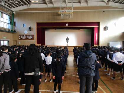 式では校長先生から2学期よく頑張ったということと新年、新しい目標をたててくださいという話がありました。生活指導からは「物・時・家」を大切にしましょうという話がありました。最後に6年児童の指揮で元気に校歌を歌いました。