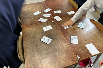 国語科の授業で、擬音語や擬態語、比喩などの表現技法を使って短歌をつくりました。「お正月」、「秋」、「習い事」など色々なテーマの短歌が完成し、最後にかるた大会をしました。「取った札のいいところを言わないと札をもらえない」という特別ルールに、子ども達は最初は文句を言っていましたが、いざ始まると「ポツポツのところが擬音語を使っていて良いと思いました!」「ボールを太陽に例えていて、素敵だなと思いました!」など、友達のつくった短歌の良さをちゃんと見つけることができており、大盛り上がりのかるた大会となりました(^^)