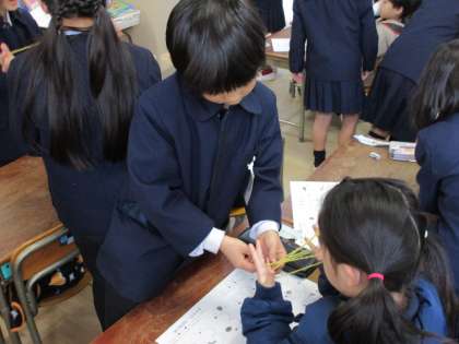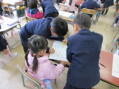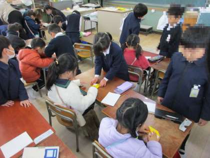 今日は保育園の子たちが小学校に来て1年生と交流しました。1年生が漢字を教えたりあやとりや折り紙を教えたりました。普段、小学校では一番年下の1年生ですが、今日はお兄さんお姉さんとして保育園児たちにしっかりと教えていて頼もしく見えました。百人一首で坊主めくりをして遊んだ組もありました。4月から茨田南小学校に入学する園児もいるということなのでとても楽しみにしています。