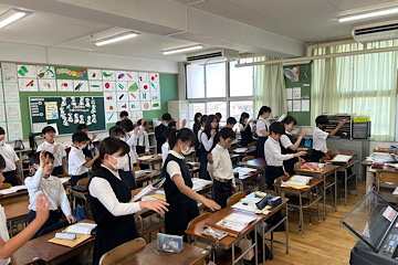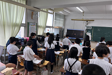 音楽の学習で、指揮の練習をしました。「おぼろ月夜」の楽譜に自分で考えて強弱記号を書き込み、その通りに指揮をします。決まった拍子で腕を振り続けられず、途中でずれてしまう児童もいて、なかなか盛り上がりました。