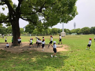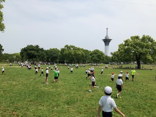 弁当を食べ終わって班遊びの時間になっています。この時間は茨田南の貸し切り状態で、大芝の広場で思いっきり走り回っています。