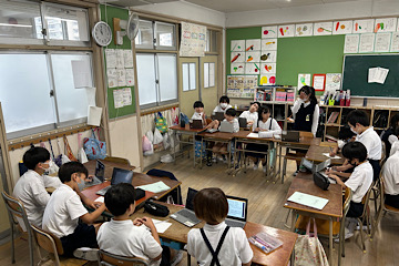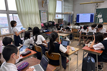 6年生はいま、ディベートに挑戦中です。今回のテーマは「住むなら一軒家がいいかマンションがいいか」です。それぞれの立場に分かれて、タブレットなどを使って情報を集めながら準備をしてきました。