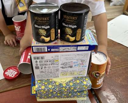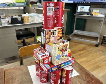 用意していただいた箱を使って、かたちの学習をしました。実際にいろいろなかたちの箱を触ったり、積んだりすることで、ころがるやたいらなところがあるなどの形の特徴に気付くことができました。箱のかたちを写し、絵も描きました。みんな楽しく学習することができていました。