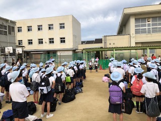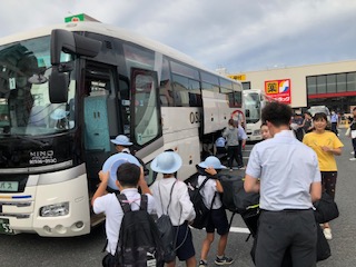 5年生が1泊2日の自然体験学習に出かけます。学校での出発式を終えてバスに乗り込みました。滋賀県マキノに向けて出発です。早朝よりお見送りいただいた保護者の皆様ありがとうございました。