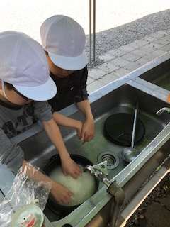 ご飯係は米を洗っています。ゆっくり慎重にやっていますが、白いお米が・・・。