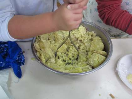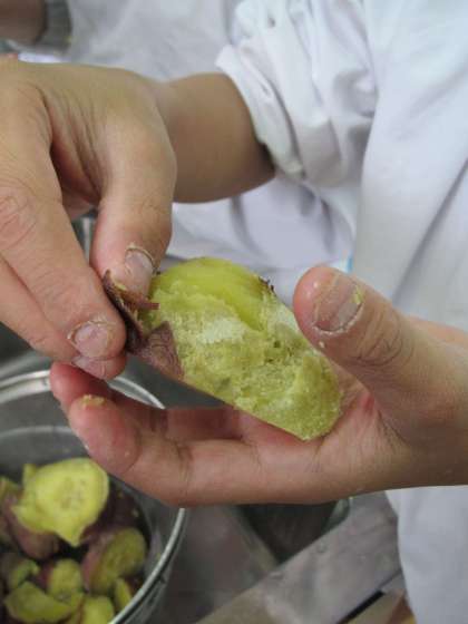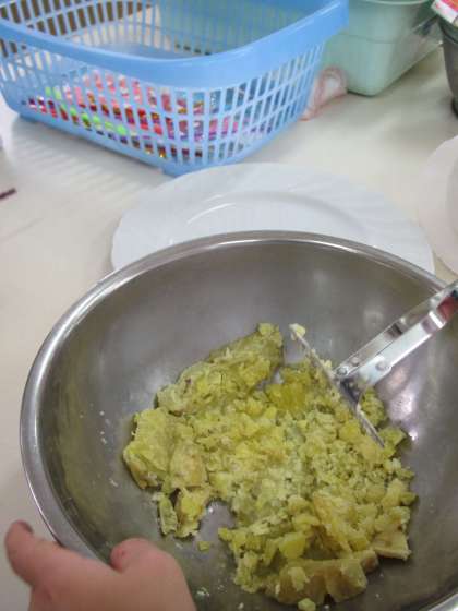 ゆでたサツマイモを冷やし、皮をむき、つぶしました。