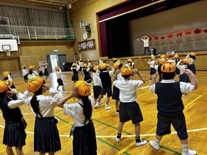 今日は1年生みんなでハロウィンパーティーをしました。自分たちで作った、かぼちゃの帽子をかぶって、「めだま運びリレー」や「おばけじゃんけん列車」、「ハロウィンパーティーに行こうよ」をして楽しみました。また、勉強や運動を頑張ってみんなで楽しいことができるといいなと思います。