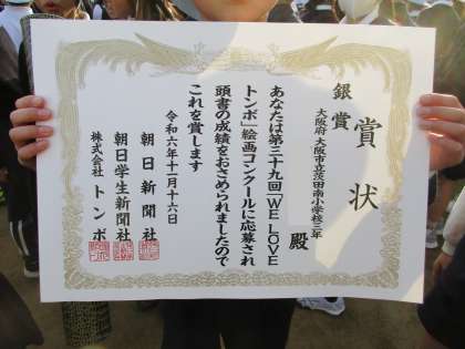 WE LOVE トンボ絵画コンクールで銀賞に選ばれた3年生児童の表彰がありました。全国規模のコンクールで毎年多数の児童が出品していますが、大きな賞をいただくことがほとんどありません。素晴らしい作品だったと思います。コンクールのサイトに作品が出rていますのでよろしければご覧ください。