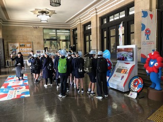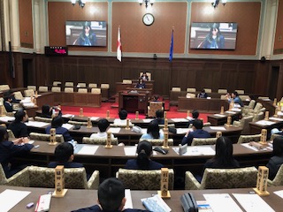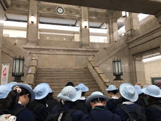 ?6年生が大阪府庁に見学に来ています。100年の歴史がある庁舎の説明を聞き、議場に入れていただきました。議場では茨田南キッズ議会を開いて議会体験をしました。